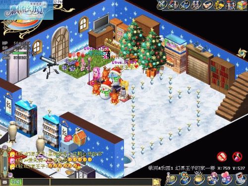 细看图中小屋,主人公像是一对情侣,安静的坐在小坐垫上,身边堆满了小雪人和麋鹿娃娃。身旁的空地上用许多装满菊花的瓶子摆出了一个大大心型,给人一种浪漫的感觉。再加上蓝色星空壁纸和白色雪地地板,整幅画面都显得十分简洁、精致!但蓝白色彩过多,内容太过安静,很难给人一种温暖的感觉哦!